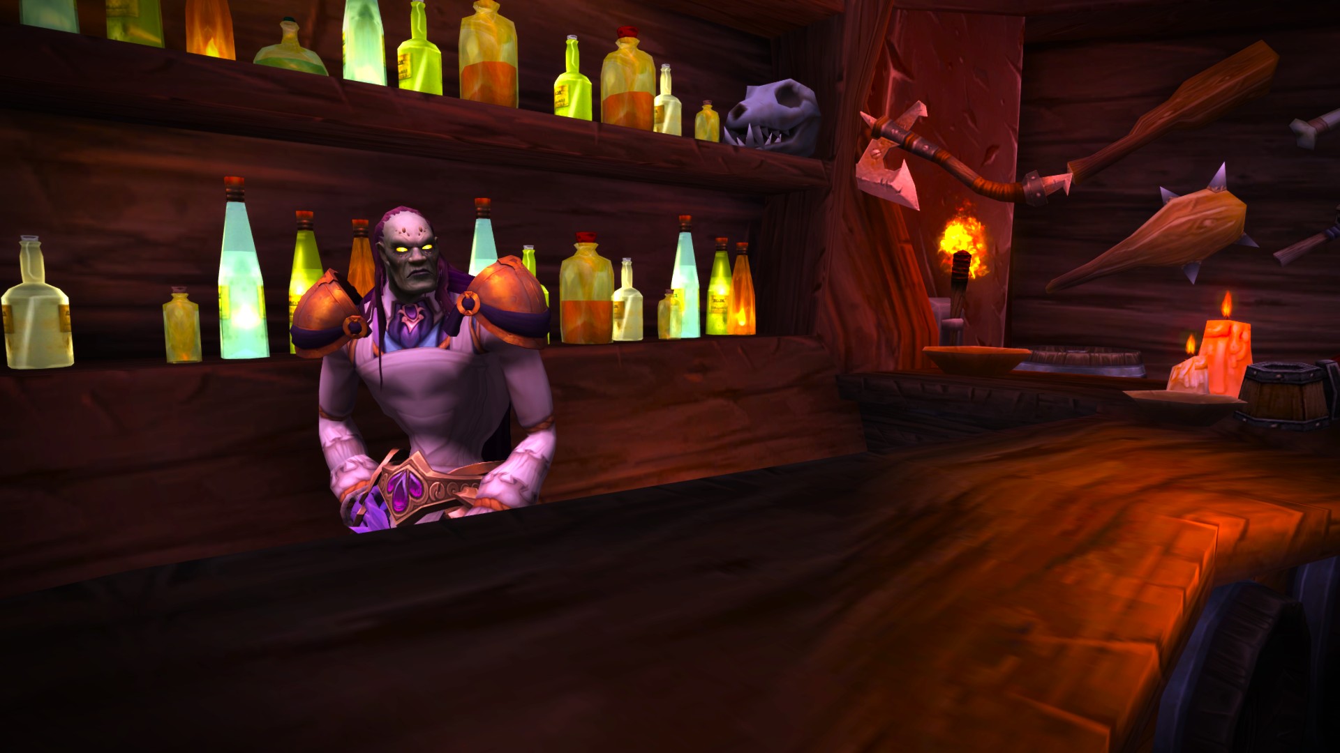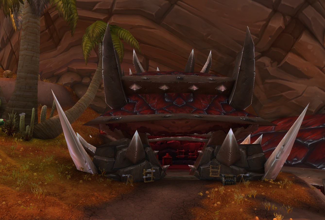 Tucked into the Valley of Honor just past the Brawl’gar Arena, the Redscar Legion’s office looks like it has seen as many battles as the warriors who gather within. The stone walls are scarred and smoke-stained, but sturdy, bearing the unmistakable mark of Horde craftsmanship. Inside, the front room serves as both meeting hall and tavern, with a long counter in one corner proudly marked The Re-Bar. The air carries the scent of spiced ale and roasted meat, and the tables are often filled with Legion members sharing stories, plotting missions, or simply unwinding after a fight. A few banners hang on the walls, their crimson hues faded but defiant.